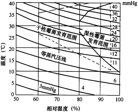 6.2.7、6.2.8 本節對圍護結構內表面抗菌涂飾工程進(jìn)行了規定,由于在食品工業(yè)用房?jì)仁褂每咕匡椆こ棠壳霸趪鴥韧庖庖?jiàn)不太統一,擔心抗菌產(chǎn)品會(huì )使食品中產(chǎn)生抗藥性菌株,但對于濕度經(jīng)常超過(guò)75%或有蒸汽作業(yè)的房間或關(guān)鍵區域的抗菌防霉問(wèn)題,目前仍沒(méi)有更好的解決辦法,內表面抗菌有很多方法,如消毒,但本規范僅對使用抗菌涂料的情況進(jìn)行了規定。當相對濕度達到80%時(shí),不論溫度高低,基本上都要發(fā)霉,見(jiàn)圖4,所以此時(shí)可涂防霉涂料。