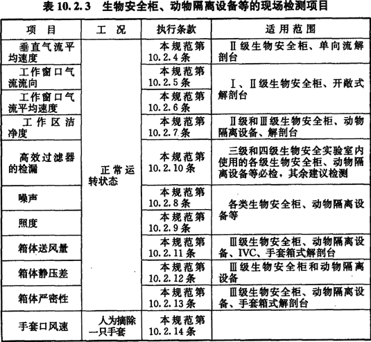 10.2.3 生物安全柜、動(dòng)物隔離設備等的現場(chǎng)檢測項目應符合表10.2.3的要求,其中第1項~5項中有一項不合格的不應使用。對現場(chǎng)具備檢測條件的、從事高風(fēng)險操作的生物安全柜和動(dòng)物隔離設備應進(jìn)行高效過(guò)濾器的檢漏,檢漏方法應按生物安全實(shí)驗室高效過(guò)濾器的檢漏方法執行。