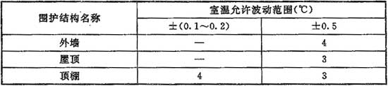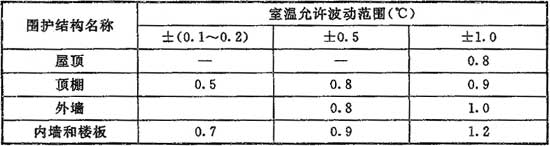8.1.8 工藝性空氣調節區,當室溫允許波動(dòng)范圍小于或等于±0.5℃時(shí),其圍護結構的熱惰性指標D值不應小于表8.1.8的規定。